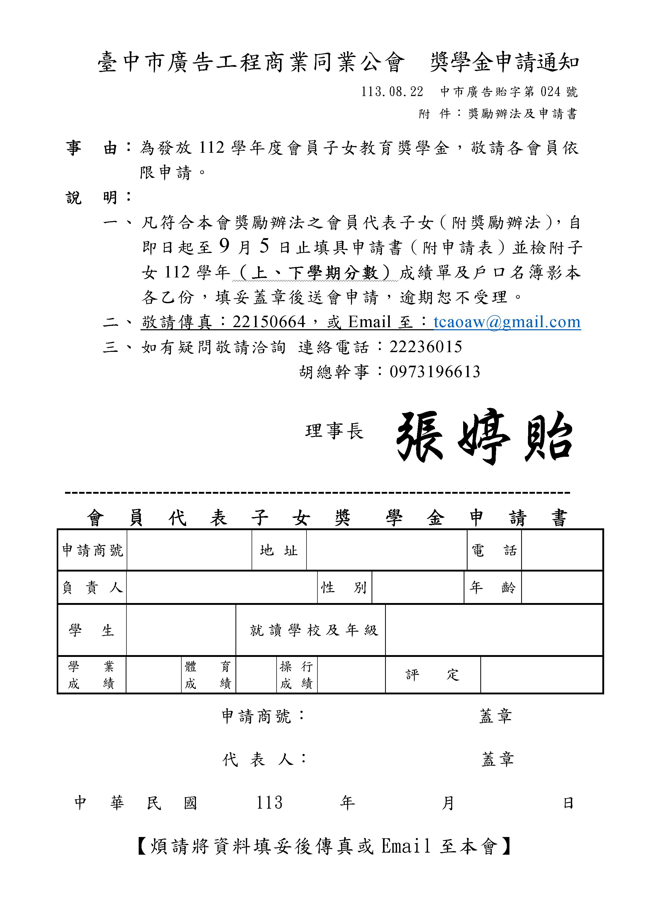 112學年度會員子女教育獎學金,敬請各會員依限申請。
