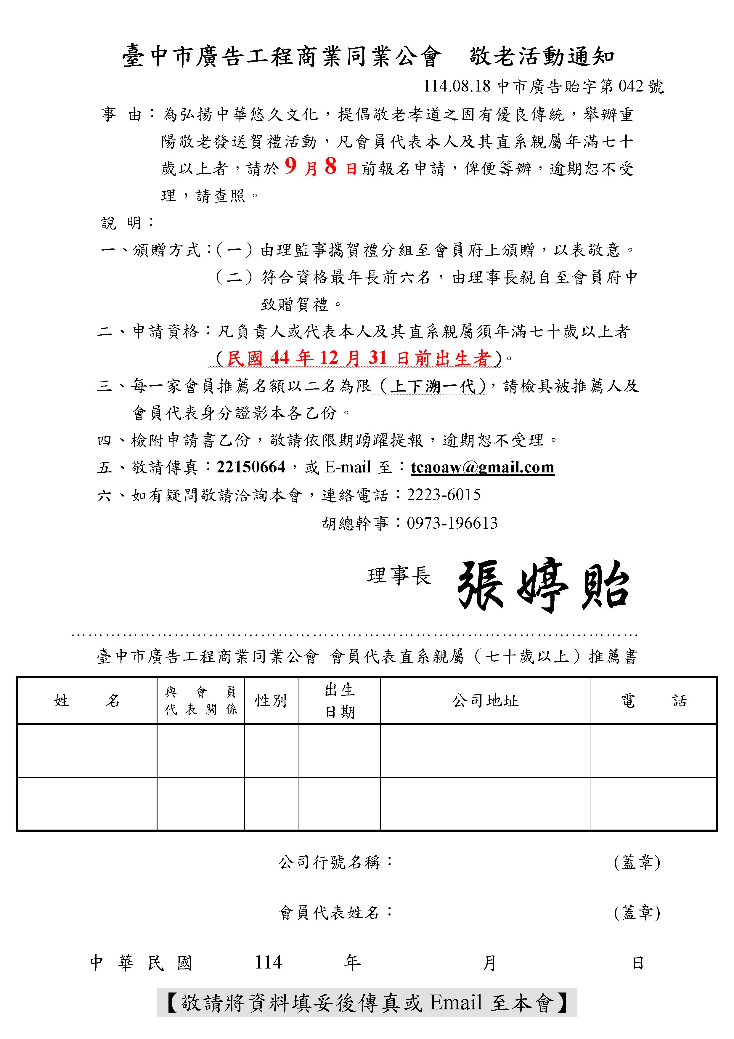 > 本會即將舉辦114年重陽敬老發送賀禮活動,凡符合申請資格者,請於9月8日前報會。