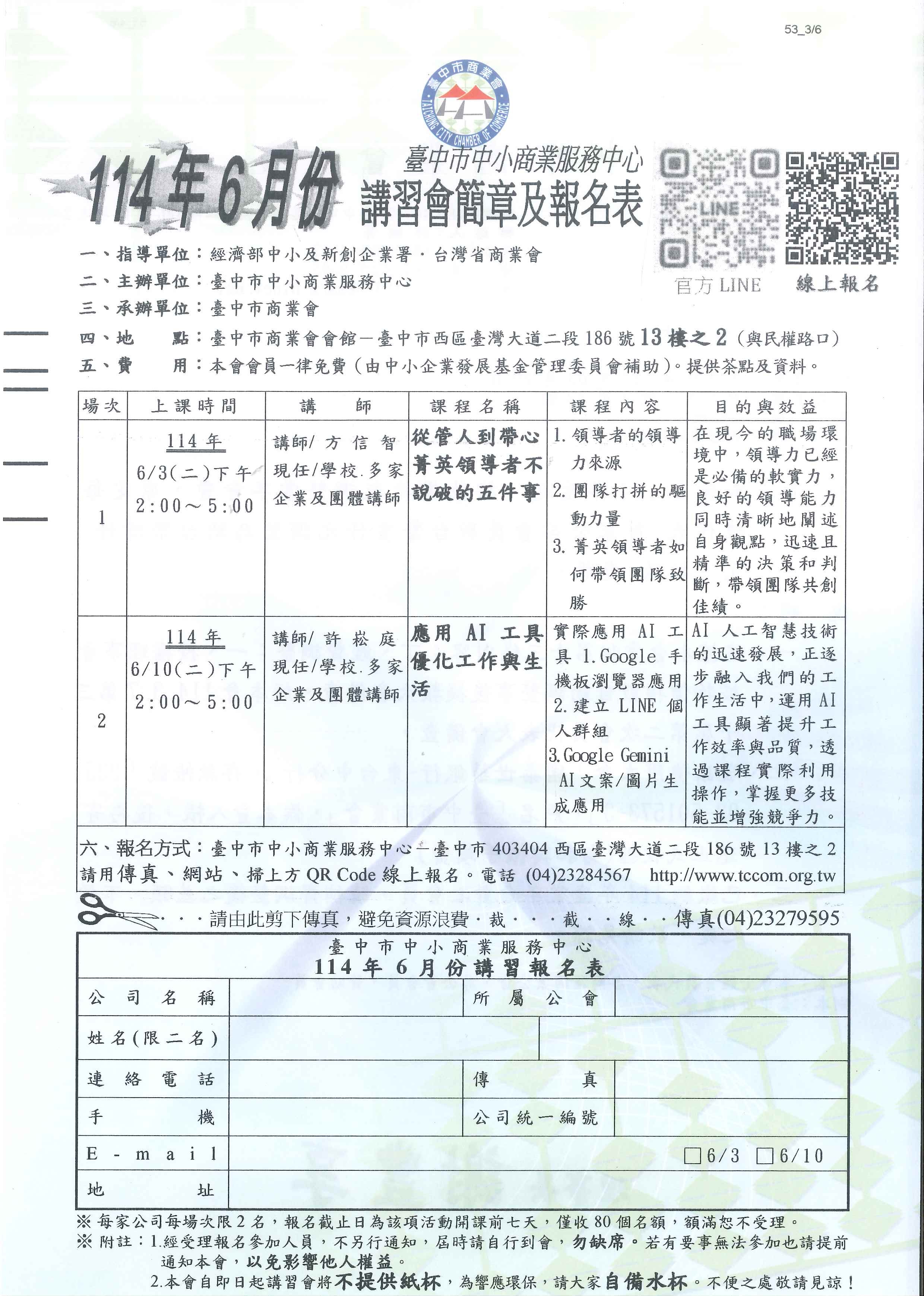 臺中市中小商業服務中心114年6月份講習報名表
