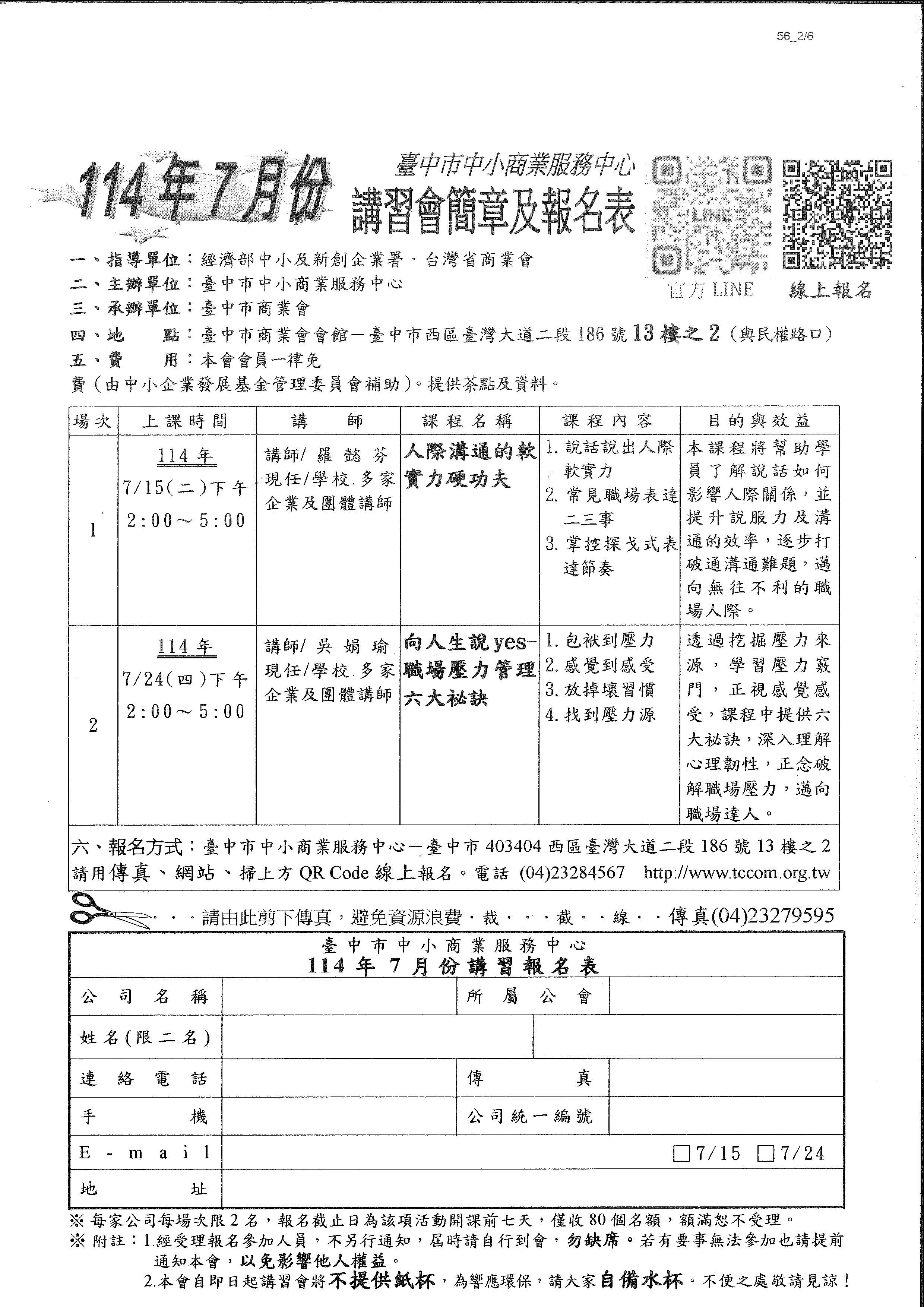 > 臺中市中小商業服務中心114年7月份講習報名表