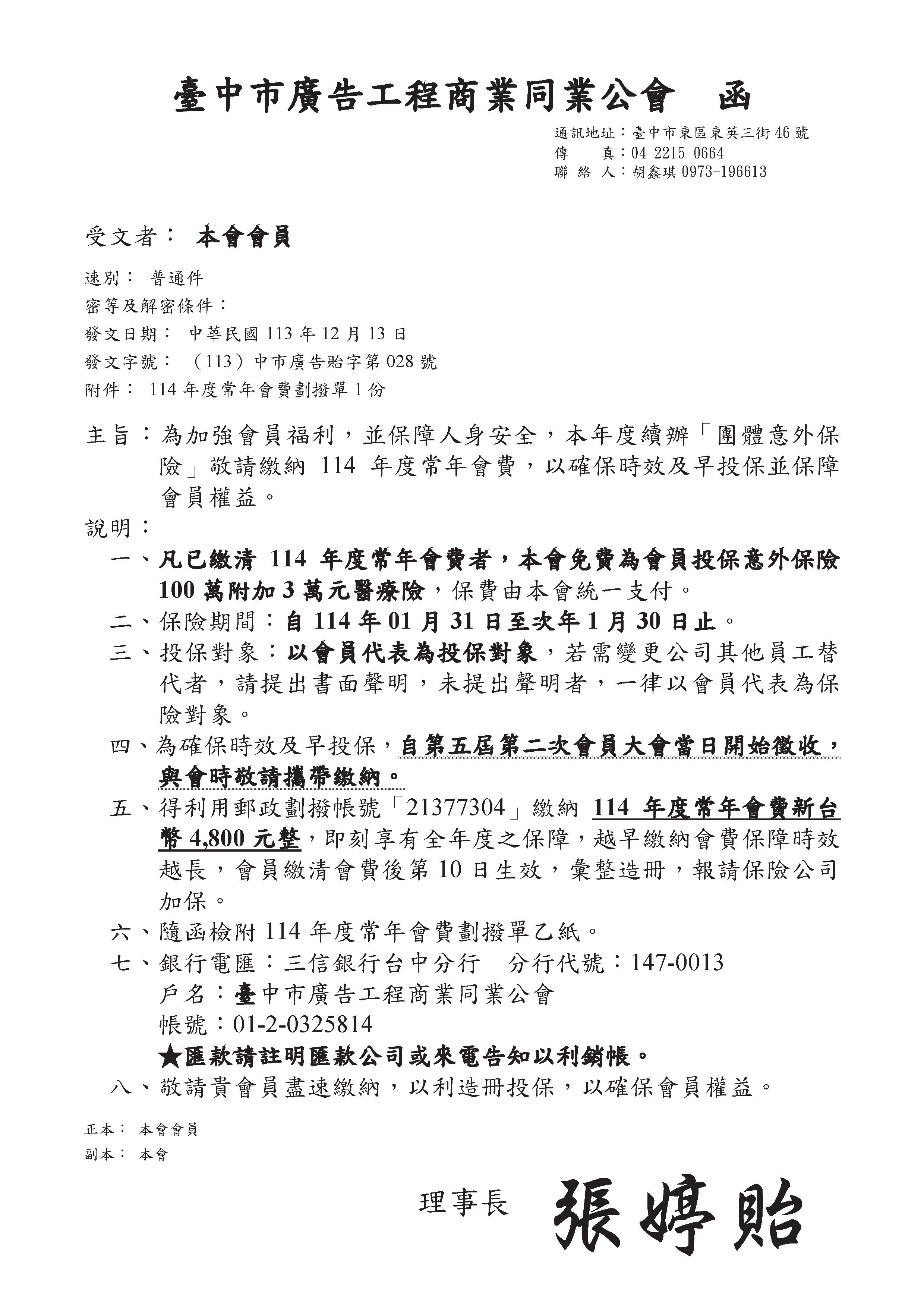 會務訊息本年度續辦「團體意外保險」 敬請繳納114年度常年會費。 http://www.tcca-aw.com.tw/zh/news/4/143.html