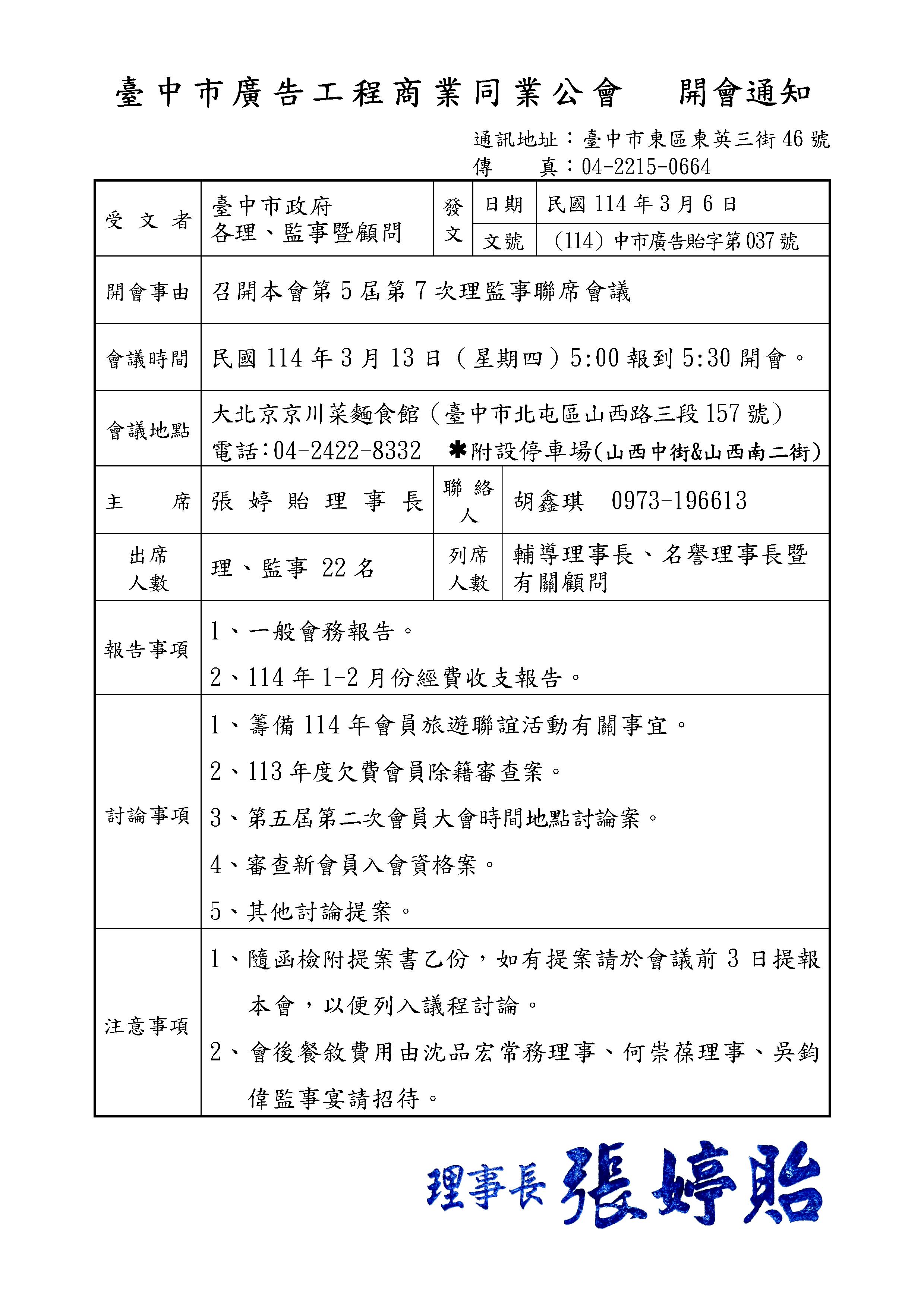 開會通知114年03月13日 召開本會第5屆第7次理監事聯席會議 http://www.tcca-aw.com.tw/zh/news/6/138.html