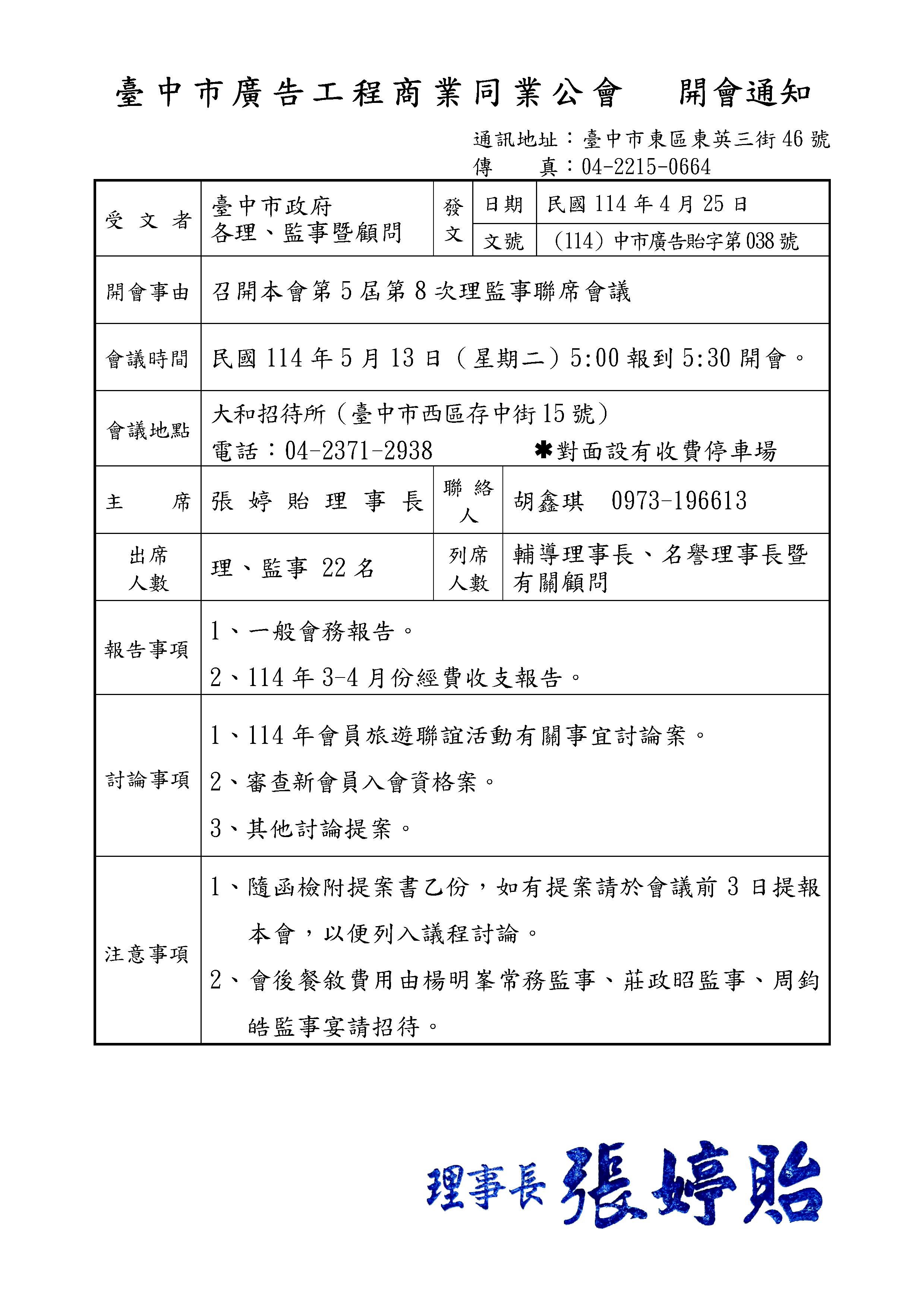 開會通知114年05月13日 召開本會第5屆第8次理監事聯席會議 http://www.tcca-aw.com.tw/zh/news/6/139.html