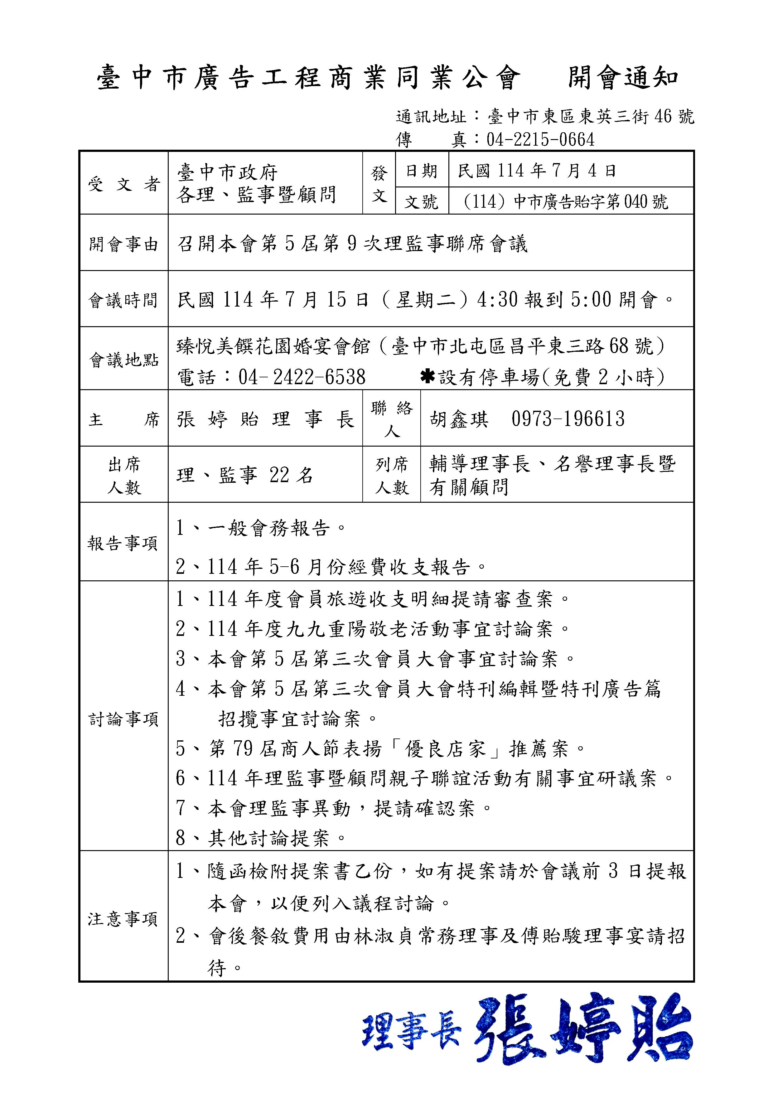 開會通知114年07月15日 召開本會第5屆第9次理監事聯席會議 http://www.tcca-aw.com.tw/zh/news/6/140.html