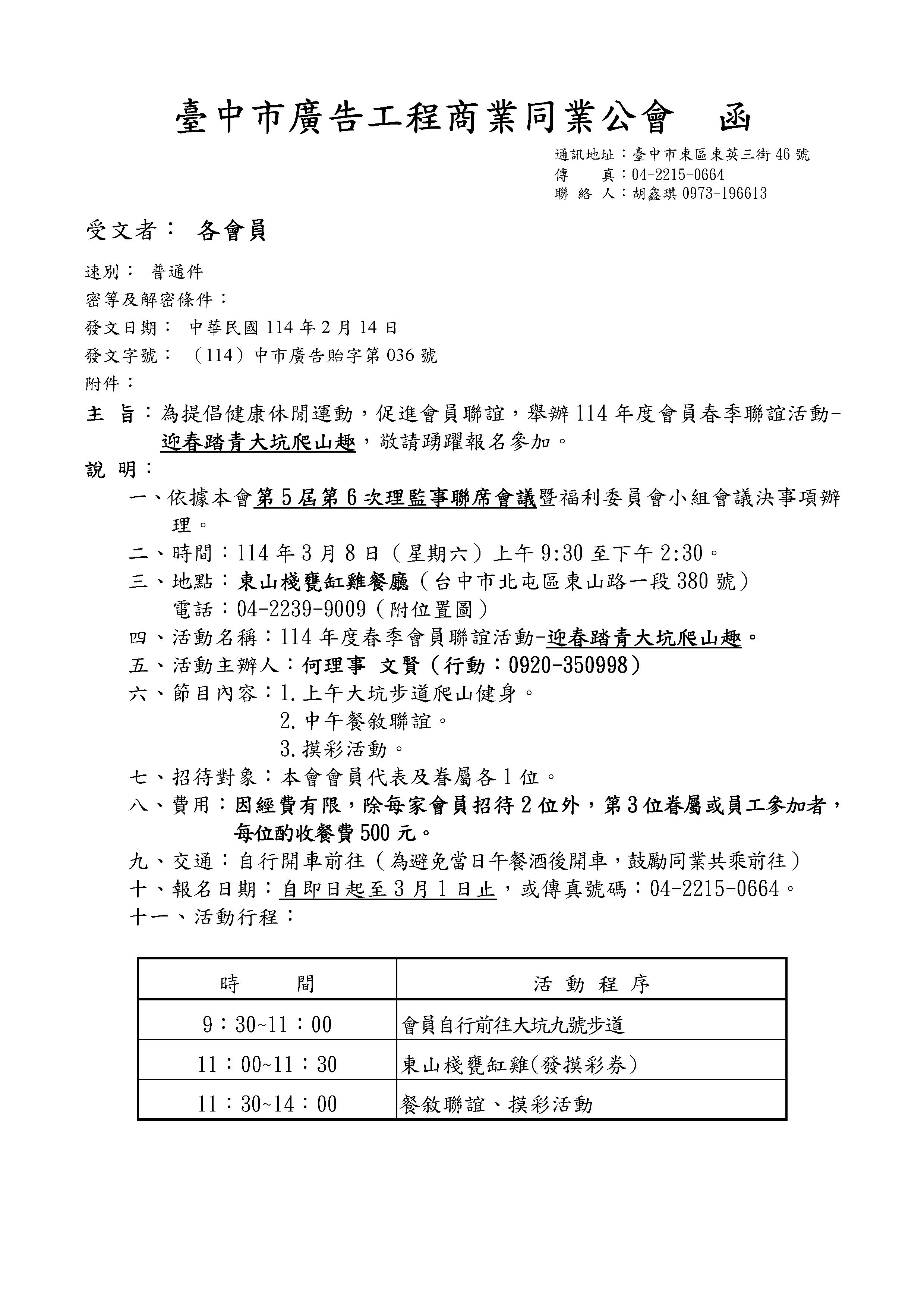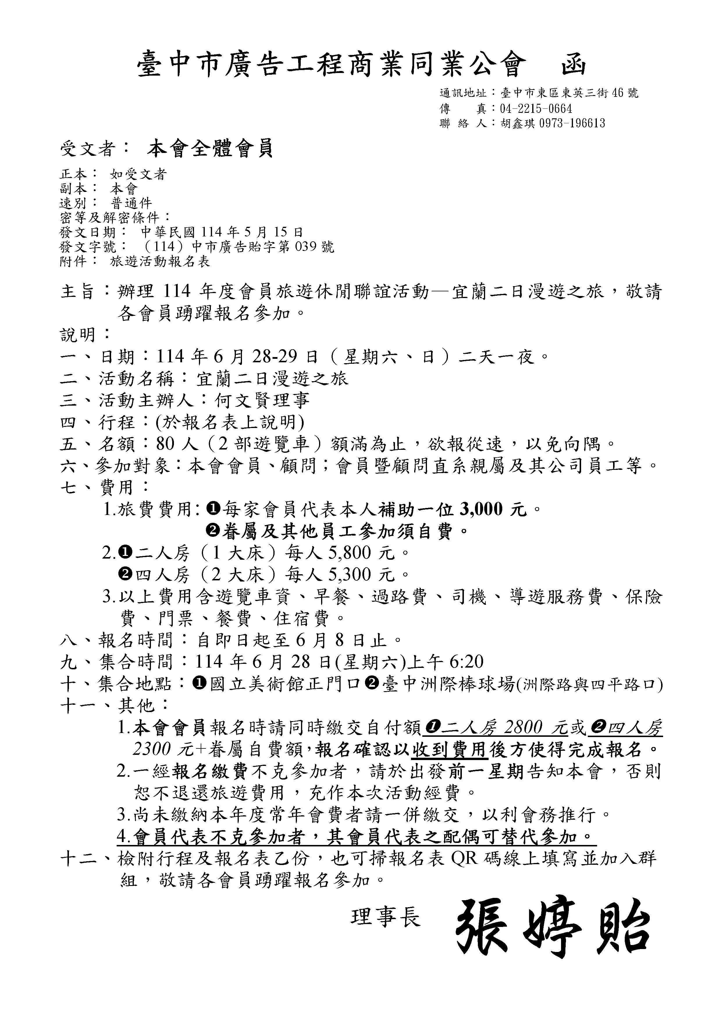 活動訊息為提倡健康休閒運動,促進會員聯誼,舉辦113年度會員春季聯誼活動-青青湖畔烤肉踏青遊記,敬請踴躍報名參加。 http://www.tcca-aw.com.tw/zh/news/8/131.html 台中市廣告工程商業同業公會  函