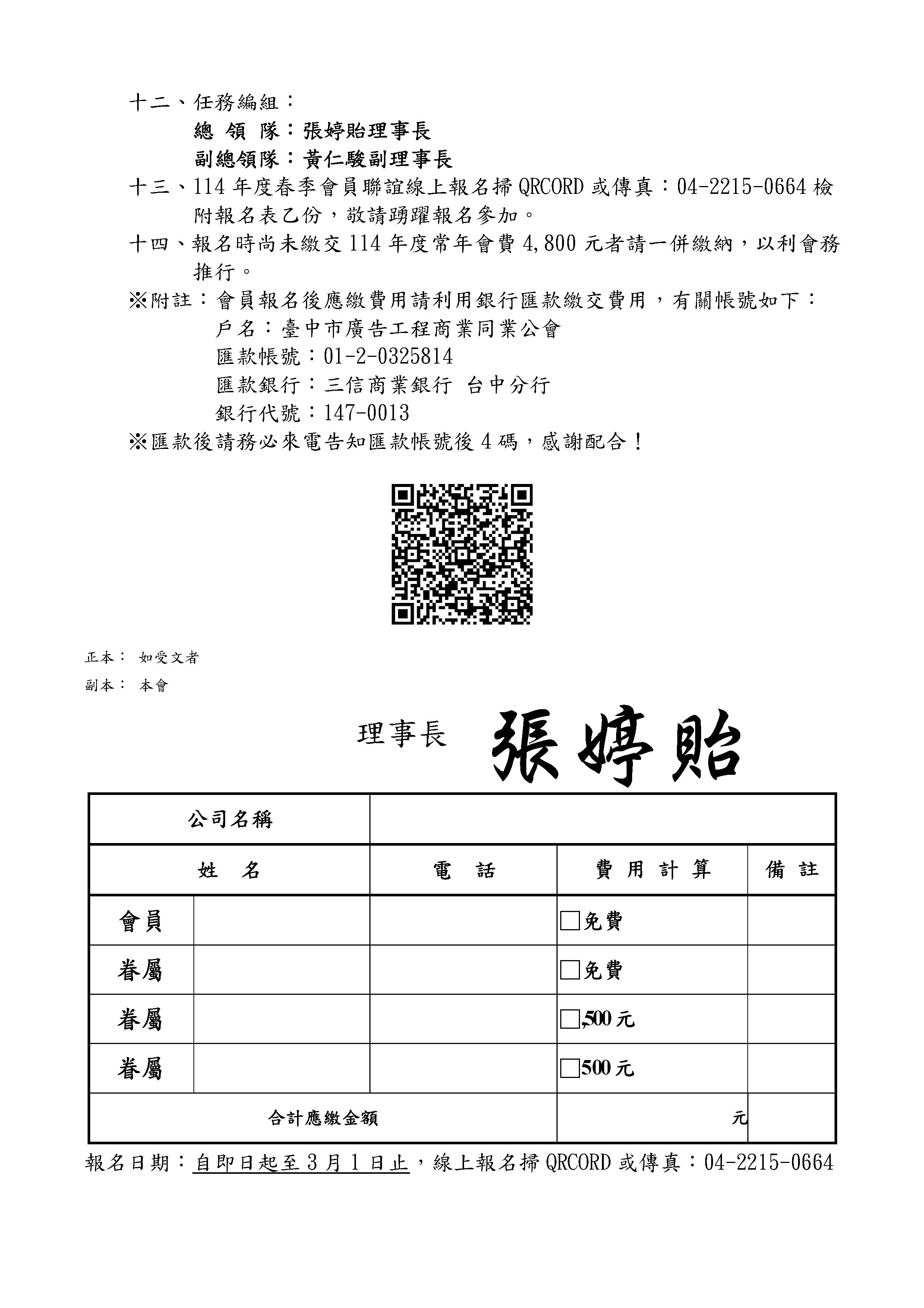 或傳真:04-2215-0664檢附報名表乙份,敬請踴躍報名參加。