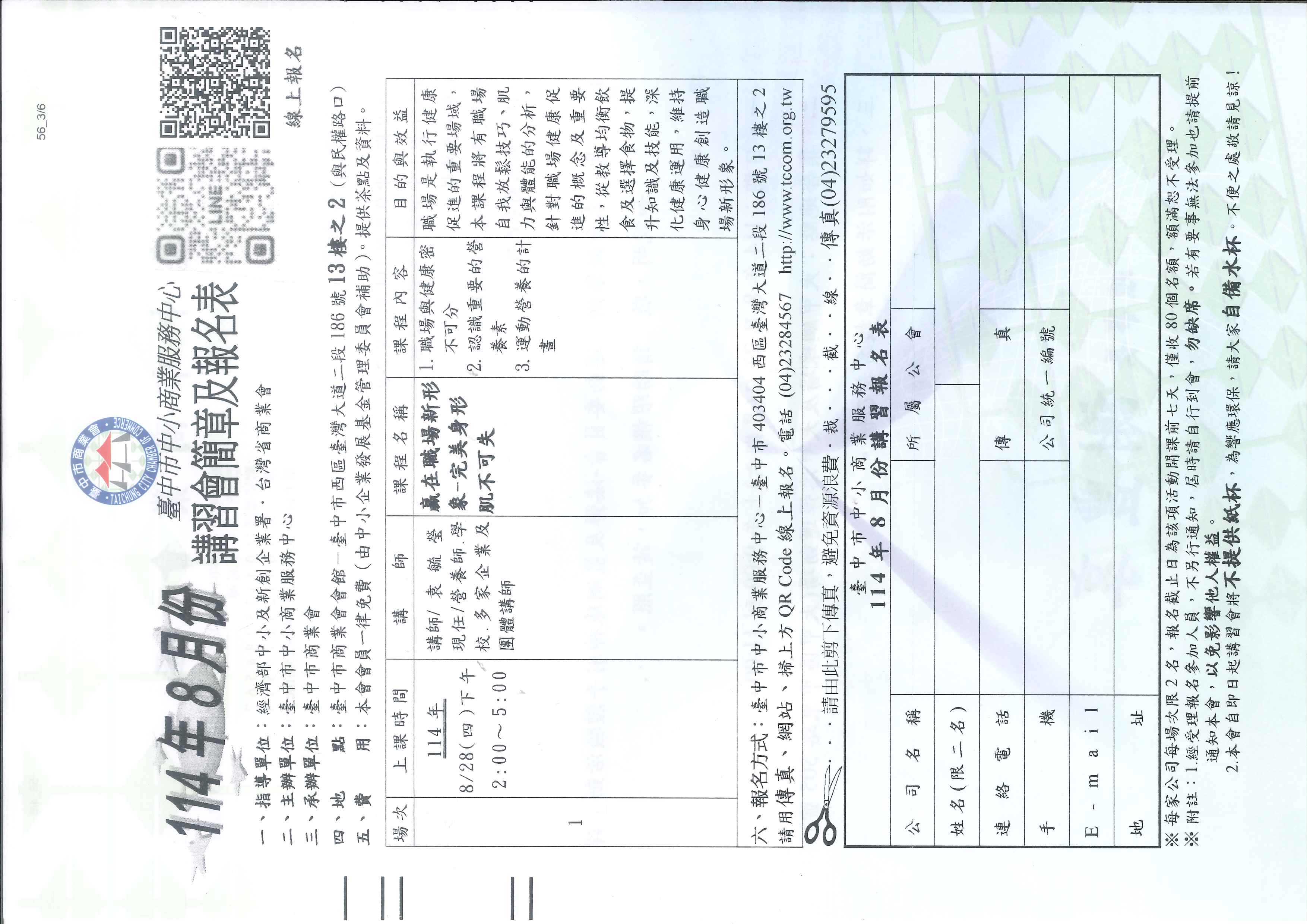 研習資訊臺中市中小商業服務中心114年8月份講習報名表 http://www.tcca-aw.com.tw/zh/news/7/156.html