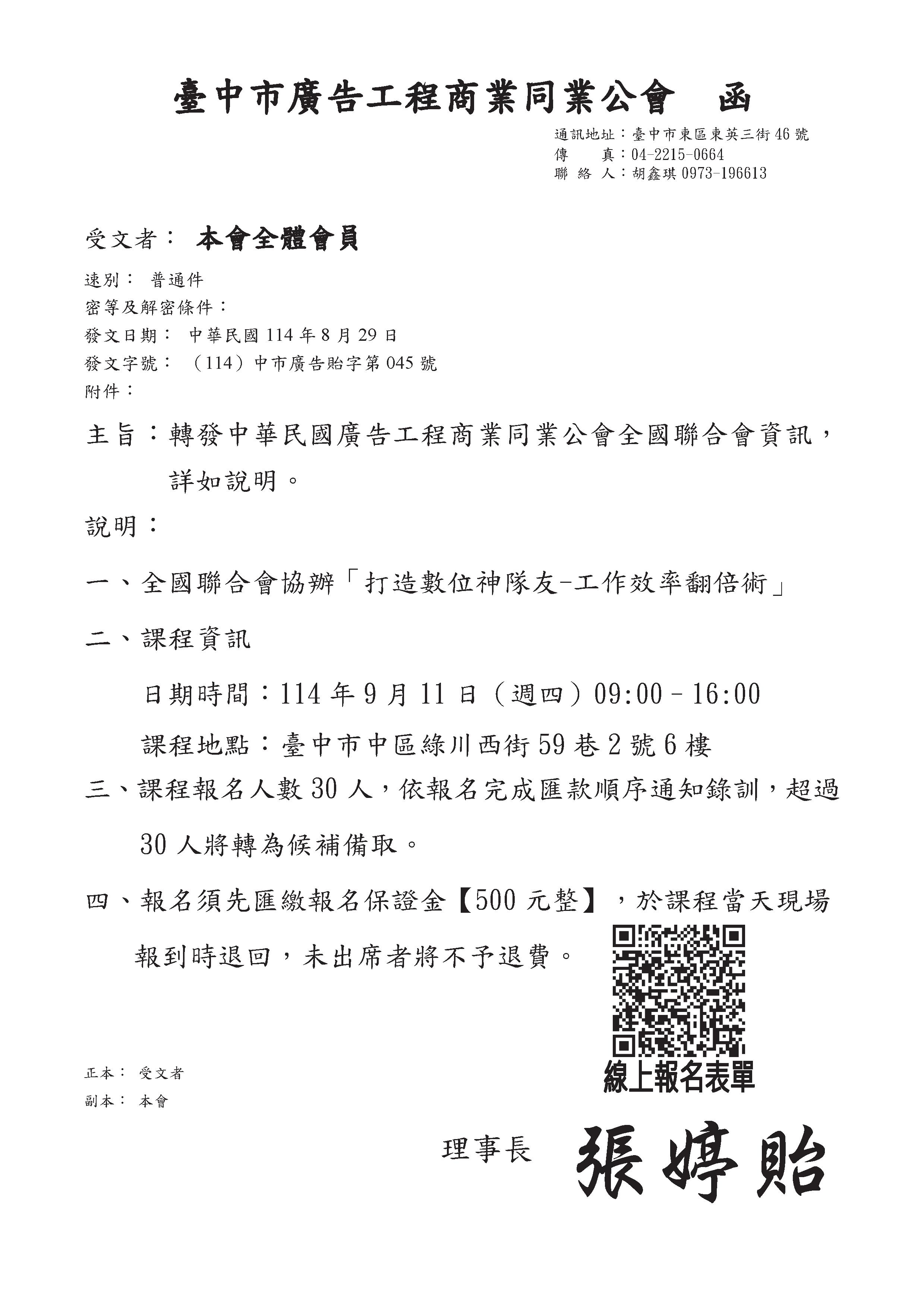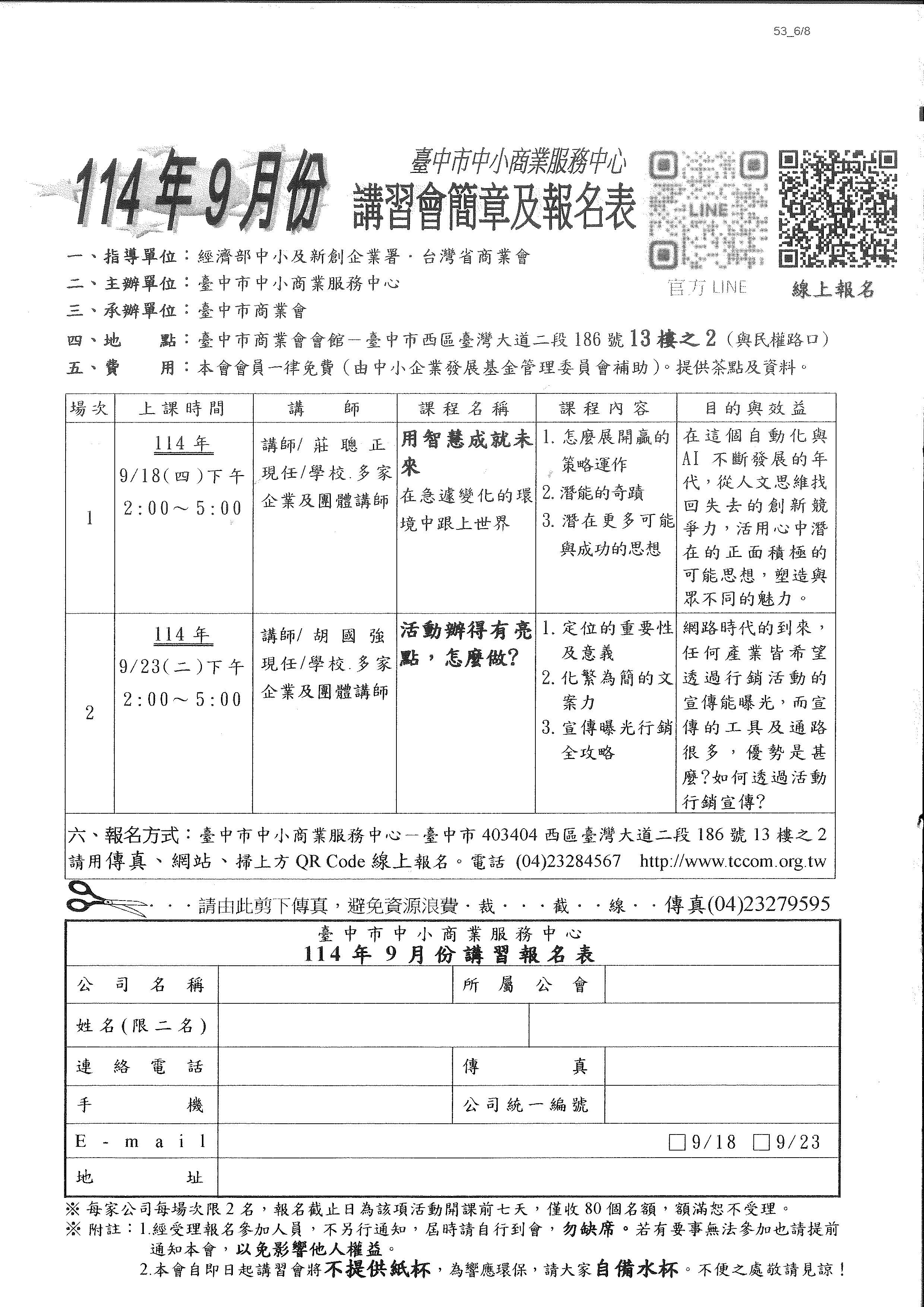 研習資訊臺中市中小商業服務中心114年9月份講習報名表 http://www.tcca-aw.com.tw/zh/news/7/157.html
